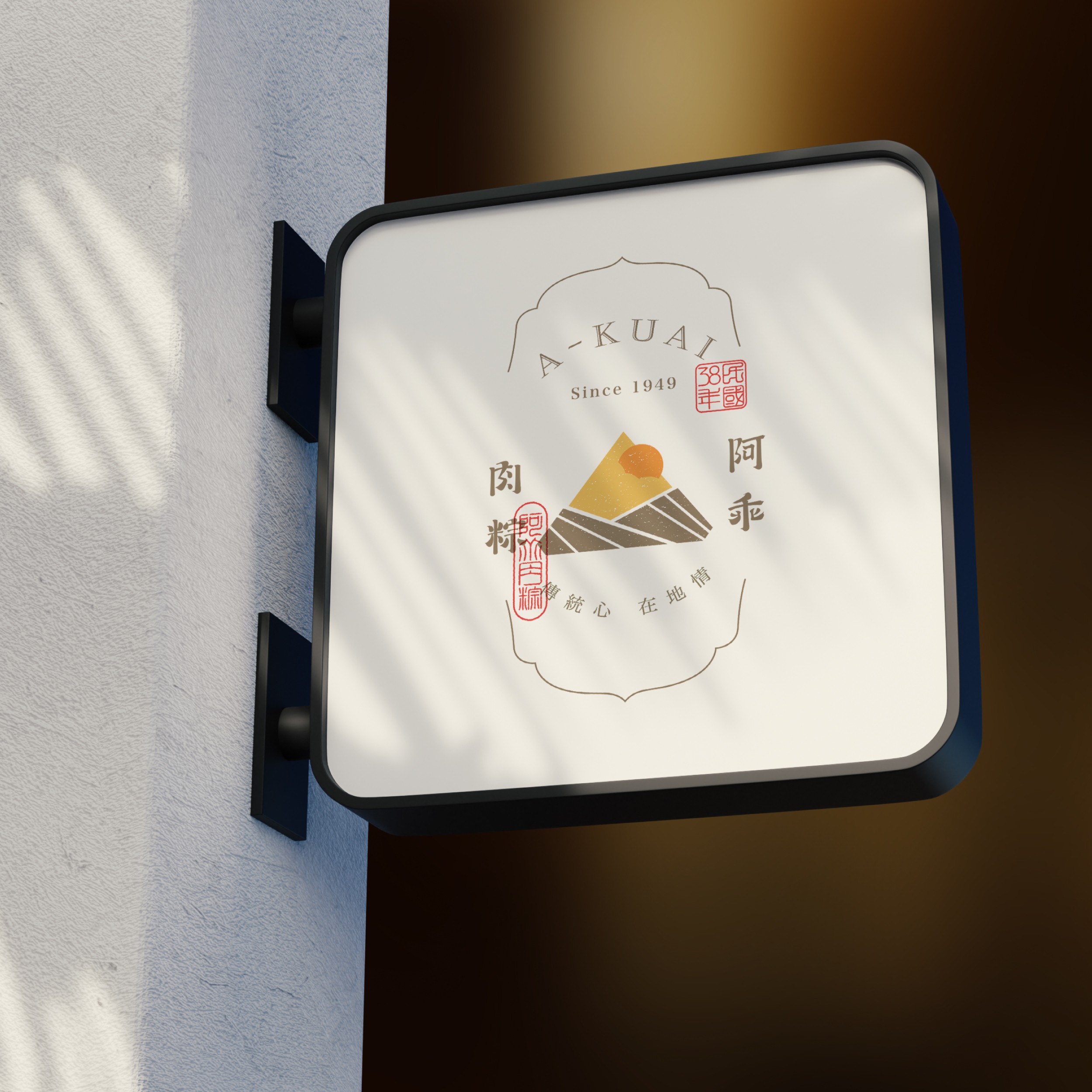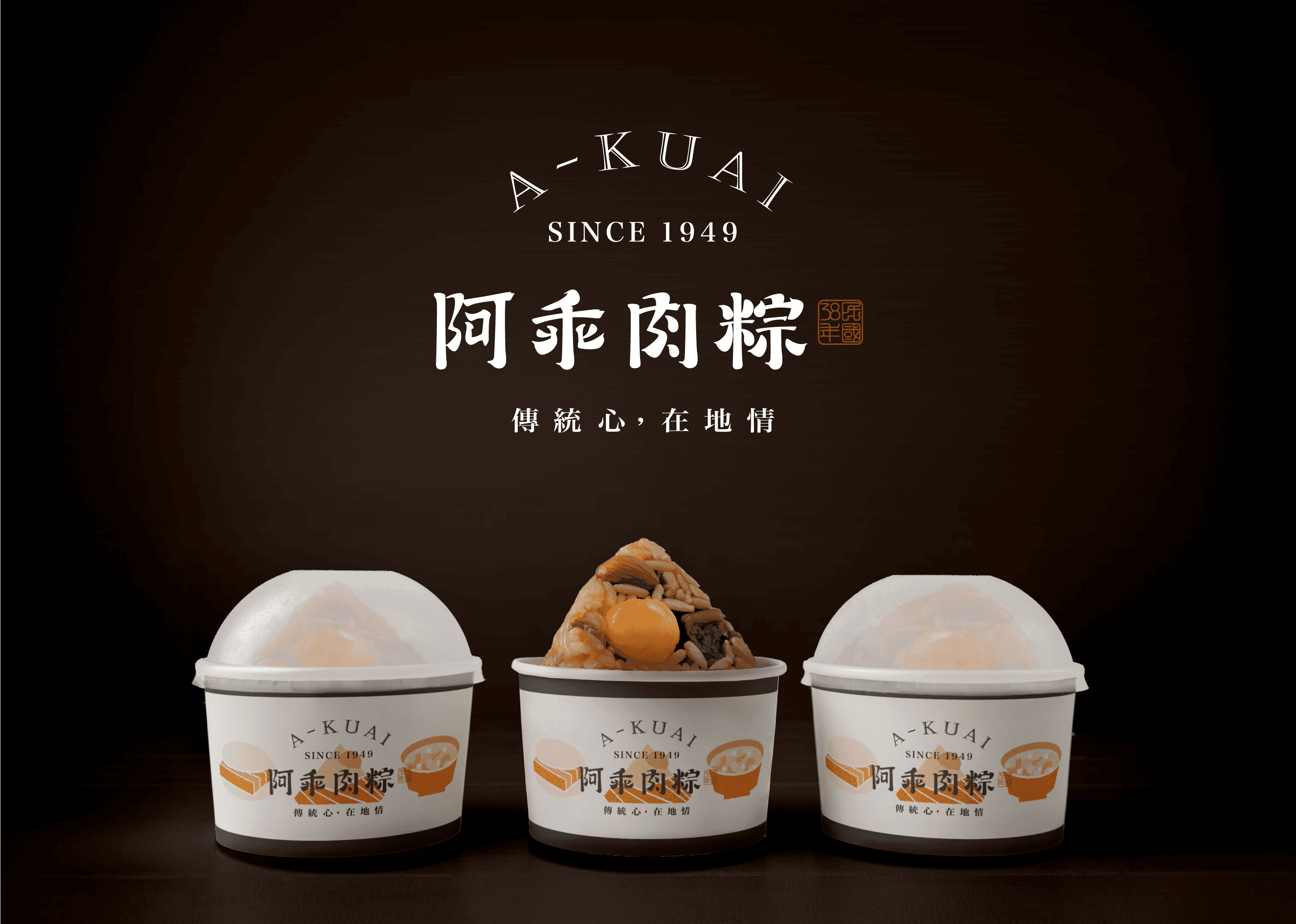 主圖標以簡約的蛋黃與肉粽造型為核心,突顯出產品的純粹美味與簡單質感。整體設計採用了家徽的形式,融合了山丘與日出的概念,象徵品牌日復一日對傳統口味的堅守與不懈追求。肉粽的三角形象徵三代人的傳承與匠心精神,深刻傳遞出家族企業對品質與味道的長期承諾與延續。 在視覺表現上,選用了沉穩的金色、橙色與褐色作為主色調,搭配手繪風格的書法字體,展現出品牌深厚的歷史感與古早味的文化內涵。金色象徵精緻與傳統,橙色則代表溫暖與世代傳承的情感延續。復古印章的元素進一步強調了阿乖肉粽自1949年以來對品質與傳統工藝的堅守,充分展現品牌多年的在地深耕與傳統製作技藝的延續與發展。